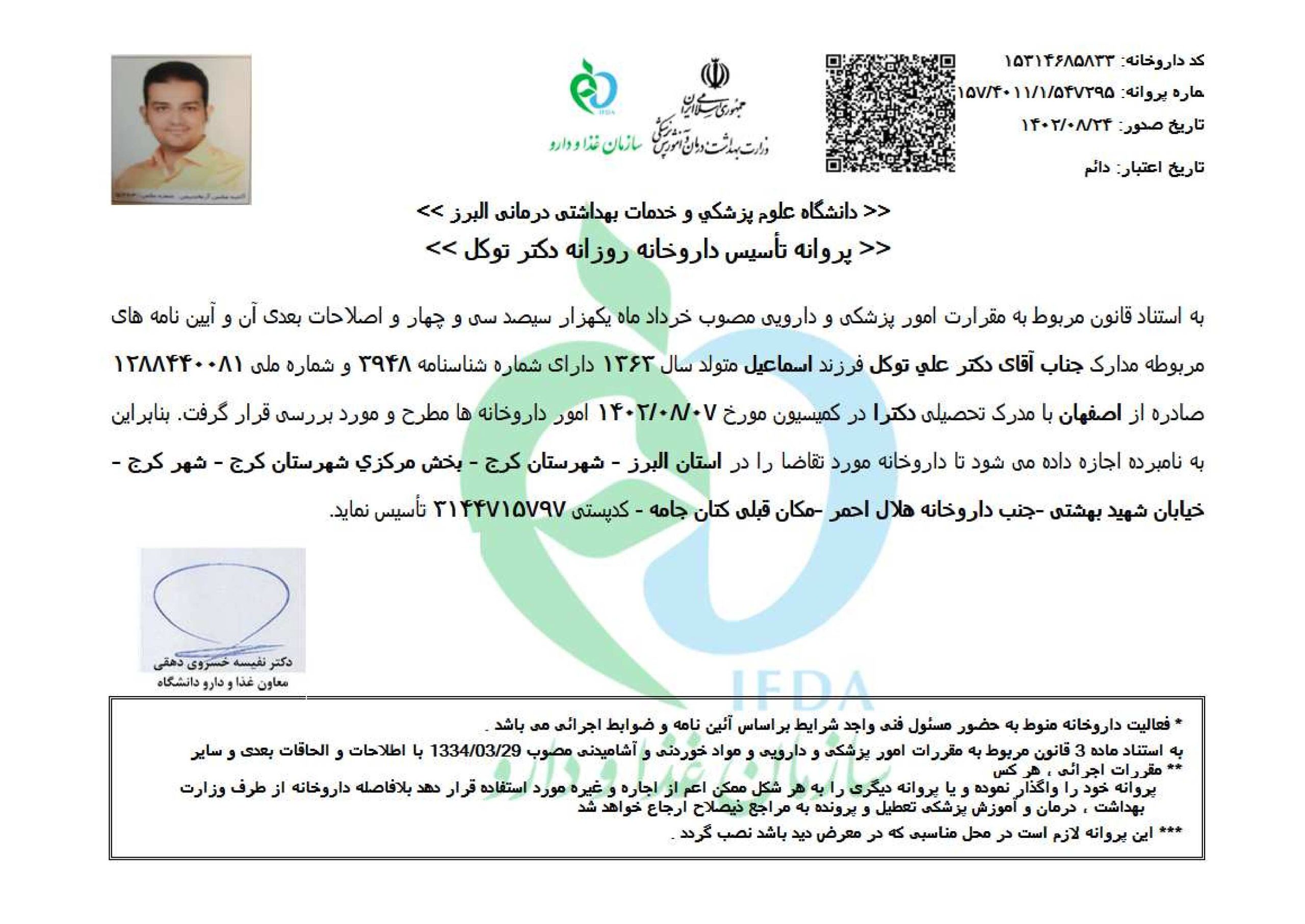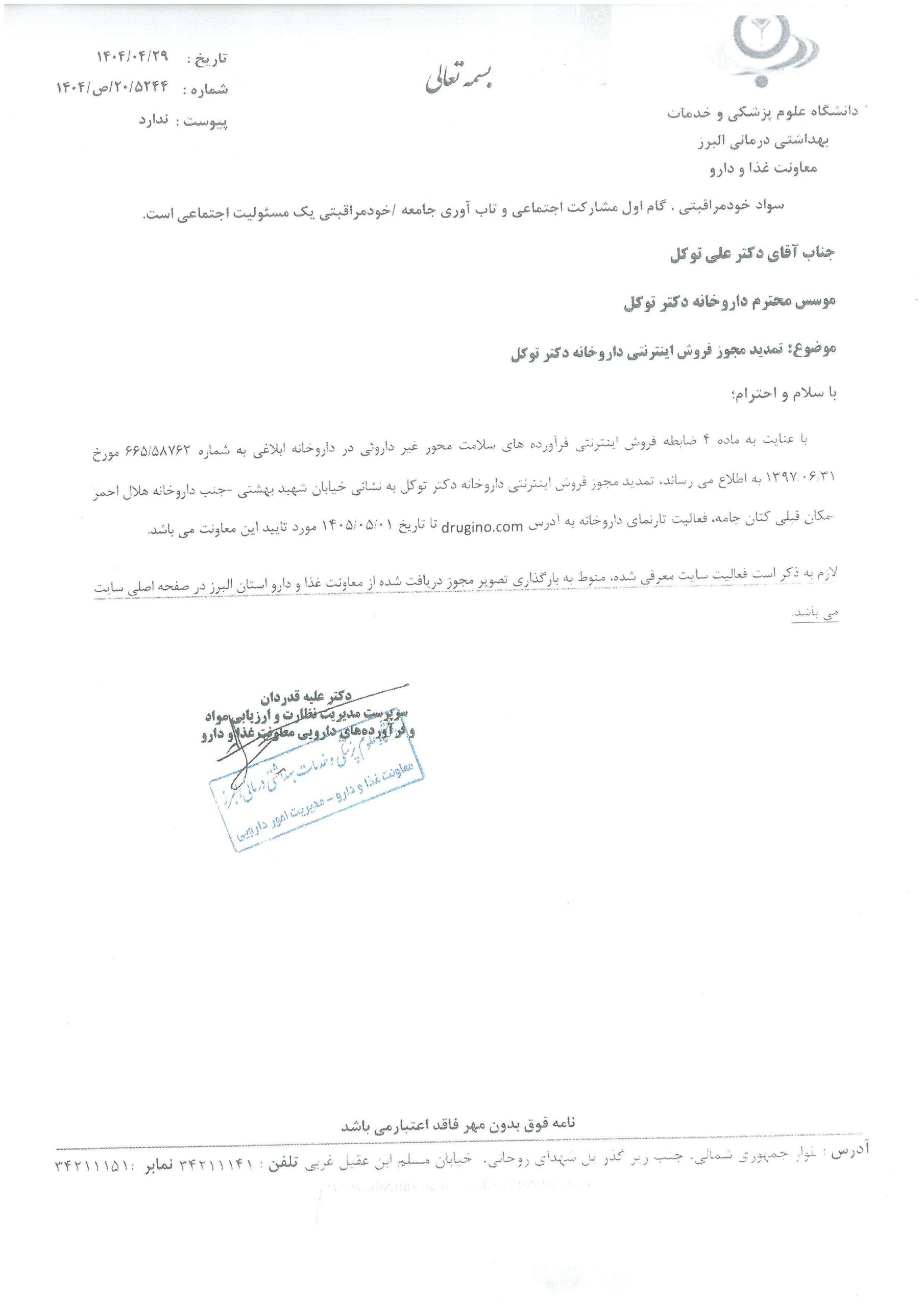 آدرس داروخانه فیزیکی: استان البرز، کرج، چهارراه طالقانی، مرکز پزشکان