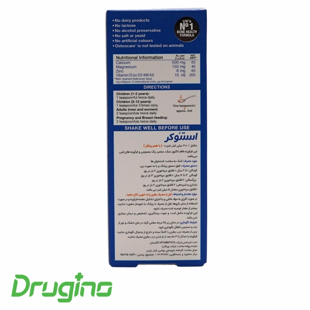 شربت استئوکر ویتابیوتیکس یک مکمل استخوانی کامل، خوش‌طعم و با جذب مناسب است که با ترکیب کلسیم، منیزیم، ویتامین D و زینک به حفظ سلامت استخوان‌ها و دندان‌ها در تمام سنین کمک می‌کند. این محصول انتخابی مناسب برای خانواده‌هایی است که به سلامت اسکلتی خود اهمیت می‌دهند و به‌دنبال یک مکمل مایع و قابل‌اعتماد هستند. برای تهیه نسخه اصل این محصول می‌توانید از داروخانه اینترنتی دراگینو جهت خرید یا دریافت مشاوره اقدام کنید.