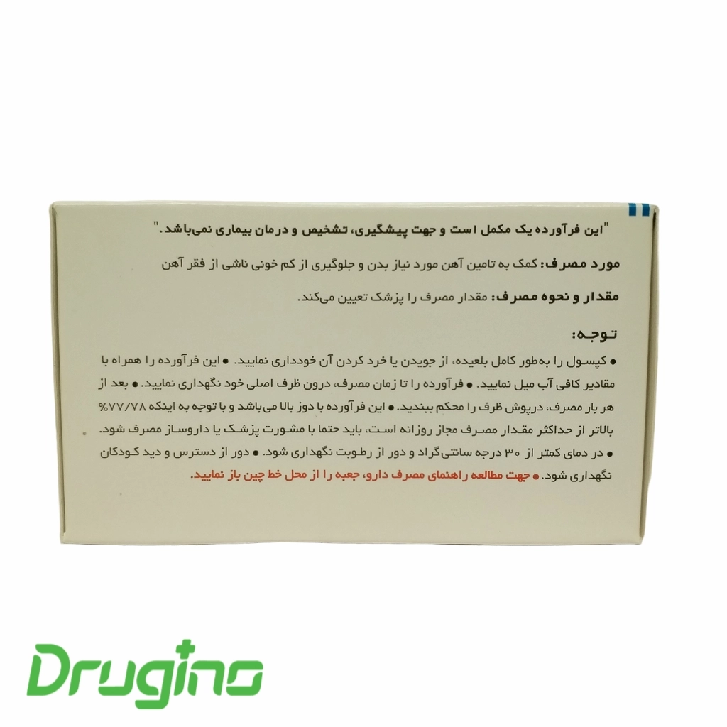 • ترجیحاً با معده خالی (۳۰ تا ۶۰ دقیقه قبل از غذا) مصرف شود تا جذب آهن در بالاترین سطح انجام گیرد.